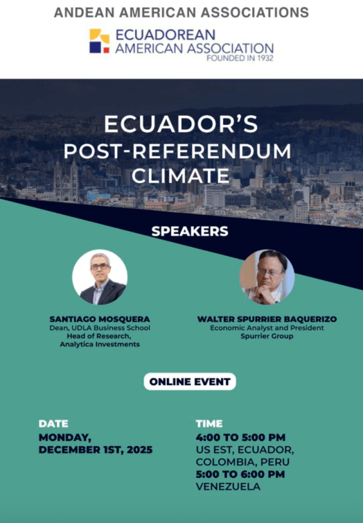 Compartí el podio con Juan Ribadeneira y Pedro Donose (ICARE) para discutir acerca de las perspectivas económicas y políticas del Ecuador en medio de un ciclo electoral.