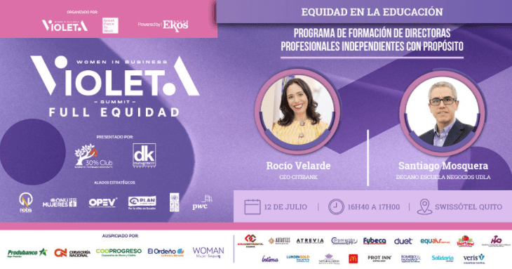 Santiago compartió escena con Rocío Velarde, CEO de Citi Ecuador, para charlar acerca del Programa de Formación de Directoras Profesionales y con Propósito, una iniciativa para capacitar a más mujeres ejecutivas líderes en sus campos para conseguir un mayor porcentaje de participación de mujeres en directorios corporativos.